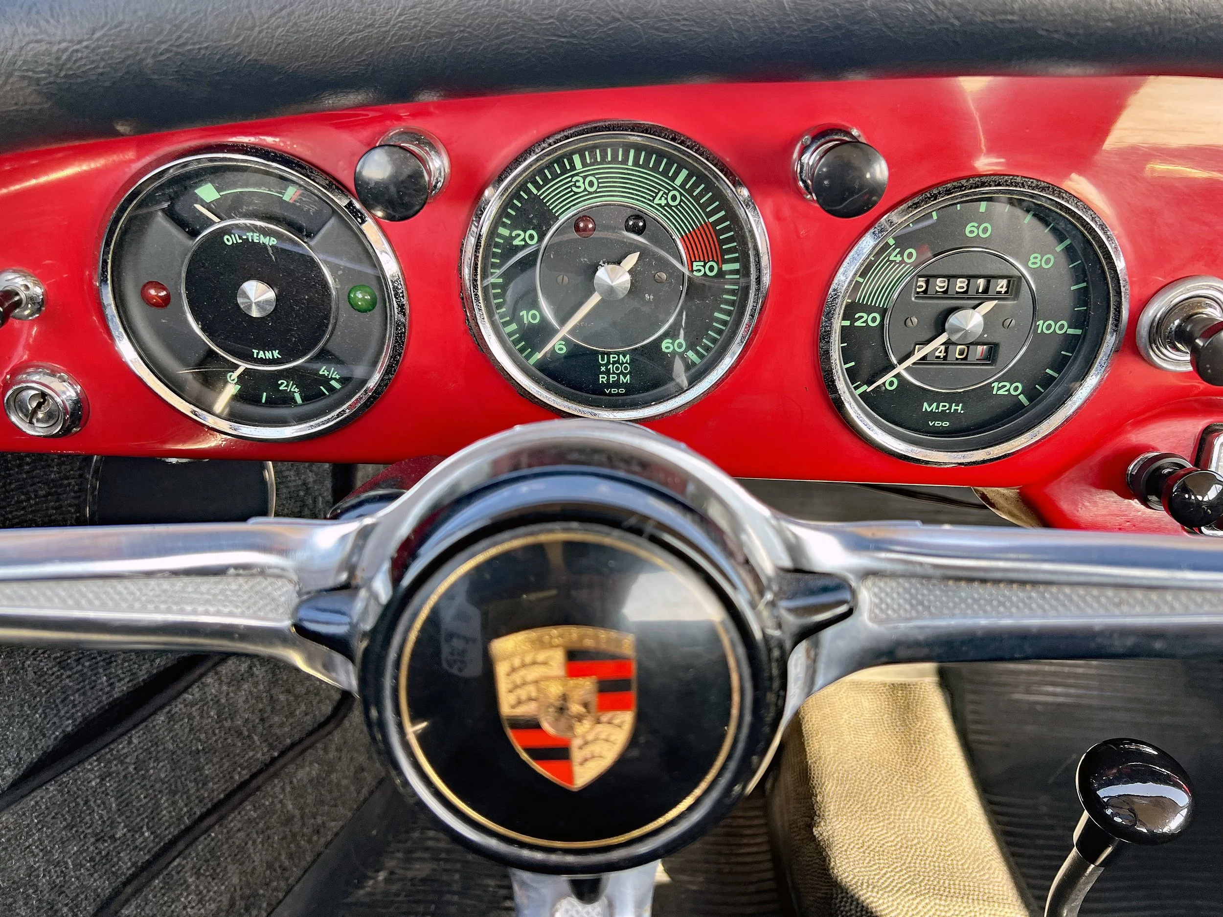While the inside of the 356B is more basic than owners became used to on later Porsches, it’s still a stylish place to be. Three large dials set into the red-painted padded dash are easily readable through the large steering wheel, with the rev counter occupying central pride of place, framed by the speedometer on the right and a clock for the oil temperature and fuel level on the left. There’s also, for those who prize originality, a period Blaupunkt push-button ‘Blue Spot’ radio, albeit one with a jack lead concealed in the glovebox for modern connectivity plus a pair of more up-to-date speakers unobtrusively lurking in the footwells.