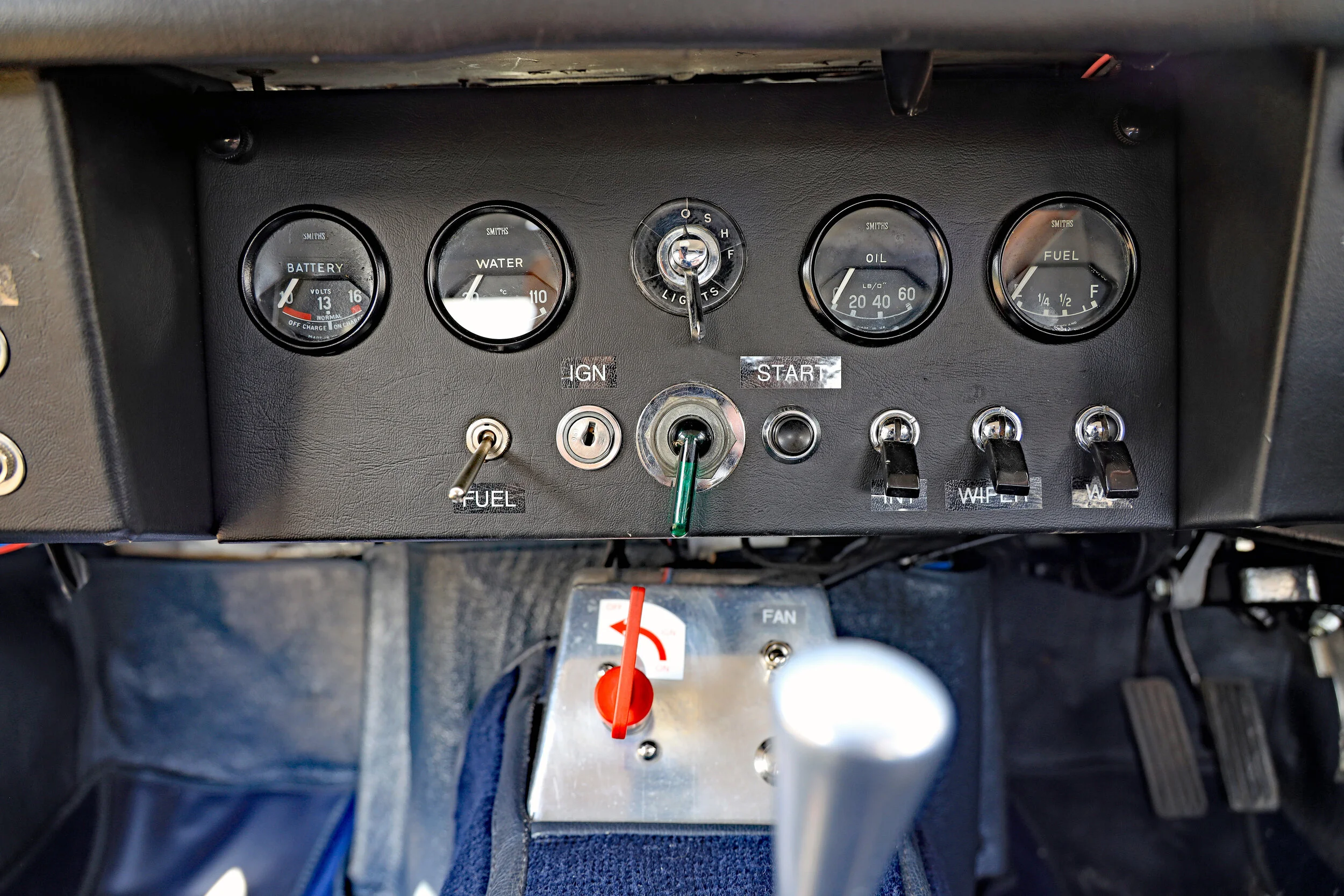 The seats are bucket items finished in blue leather and set in aluminium frames. They look like they’ve barely been sat in, as there’s only very minimal creasing. The carpets, door cards, floor mats and four-point harnesses are all finished in blue, and in very good nick although, inevitably, the driver’s matt does show some signs of shoe abuse. All the gauges work as they should and display healthy readings. While the speedometer looks like the standard 1960s’ item, its odometer is digital.