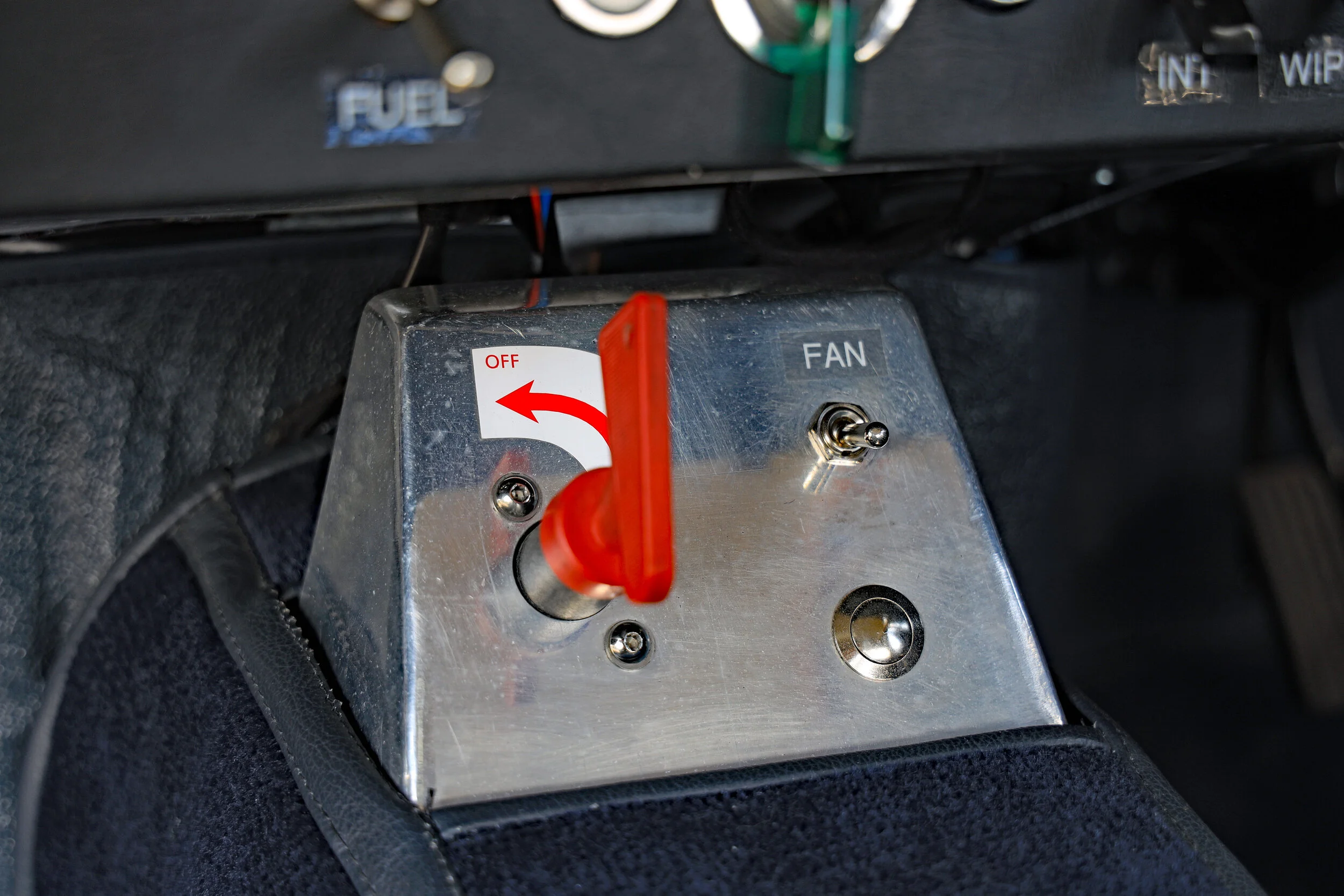 With the emphasis on a racing-focused cockpit, there are few creature comforts inside the E-type. Any passenger gets a collection of circuit breakers to look at, while there are battery and fan switches set into an alloy panel on the widened transmission tunnel. Fuel delivery can be cut off by the long toggle switch on the dash.