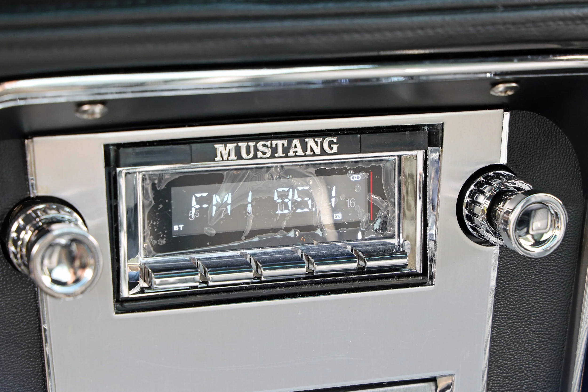 Inside, the flamboyant cabin is close to spotless, with very few signs of wear anywhere. The vinyl seats look almost like they’ve never been sat in. All the gauges and gauges work – including the clock – and even the indicator flashers set into the bonnet are functioning as Ford intended, as are the red and white lights that come on when the doors are open. Lap-belts are fitted for the rear seats. The carpets are protected by over-mats branded with Mustang logos. One nice upgrade is the digital radio, with a retro-style fascia that blends in perfectly with the rest of the car. It still has transparent plastic protecting it.