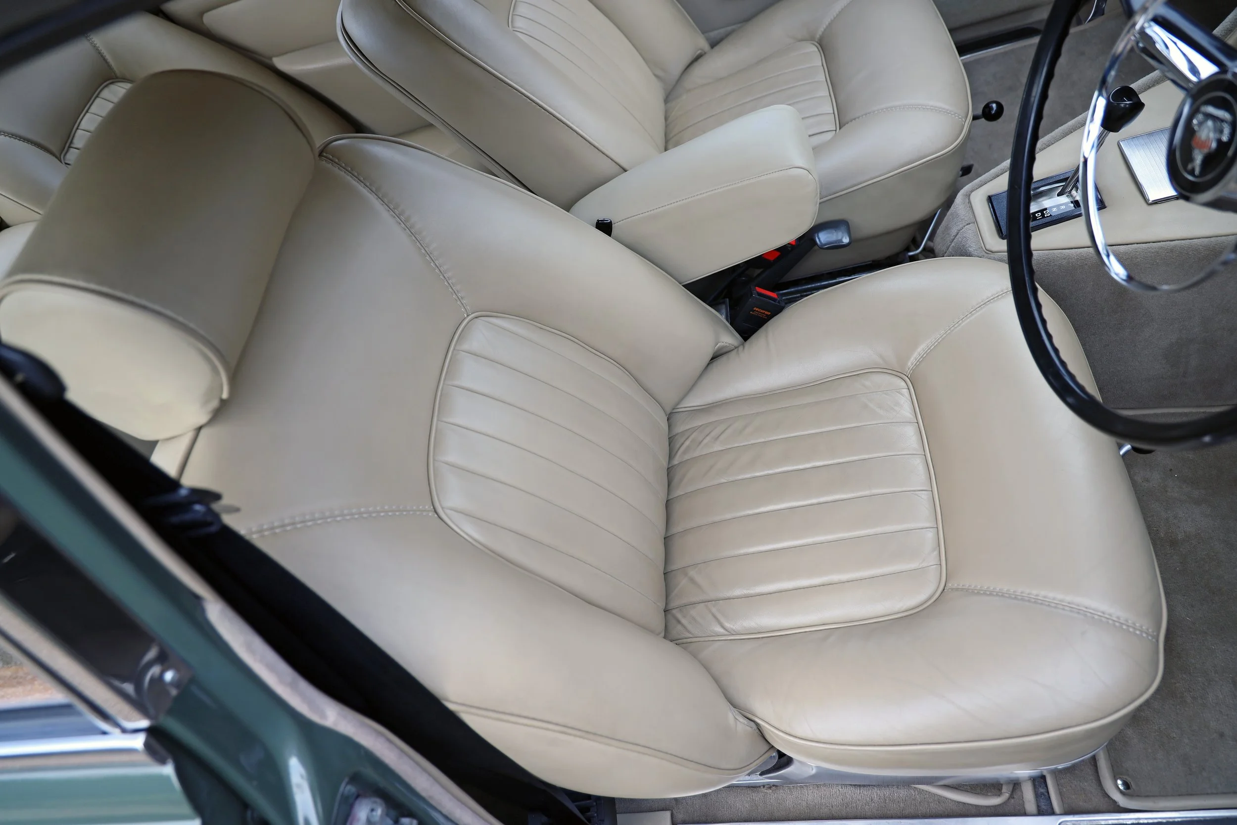 This very smart P5B Coupe was registered in July 1969, just a few days before the crew of Apollo 11 landed on the moon. From the information in the extensive paperwork folder, it seems that it was originally Bordeaux Red with Silver Birch Roof, with Parchment leather and beige wool carpets inside. By the 21st century it had passed into the hands of a true P5 enthusiast, who’d owned multiple examples. He had it restored and recommissioned around 2010 at a cost of around £11,000. There was further extensive work in 2012 and 2015 during which, presumably, the current colours of two-tone green and grey were adopted.