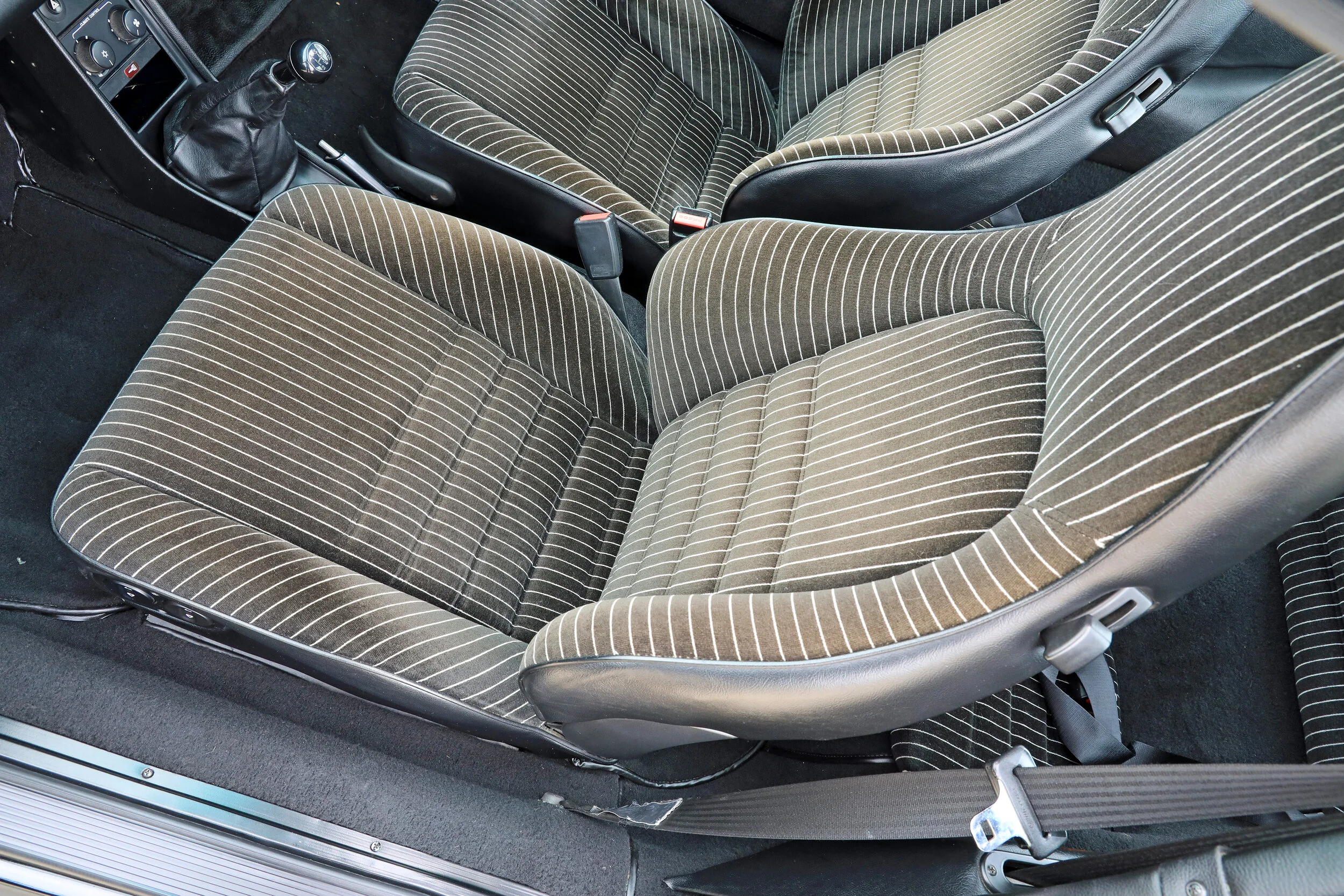 The black theme is slightly broken up by the interior - granted, the dark shade is the predominant theme, but there are white pinstripes on the seats, which are black leatherette with fabric faces. As with the exterior, the interior is superbly preserved. There is next to no wear to the cloth, and the only fault of any note is that the driver’s side seat bolster nearest the door has a small patch of repair tape. It’s not especially noticeable unless you’re looking for it; we suspect the seatbelt buckle may have got trapped by the door at some point, and dug into the leatherette.