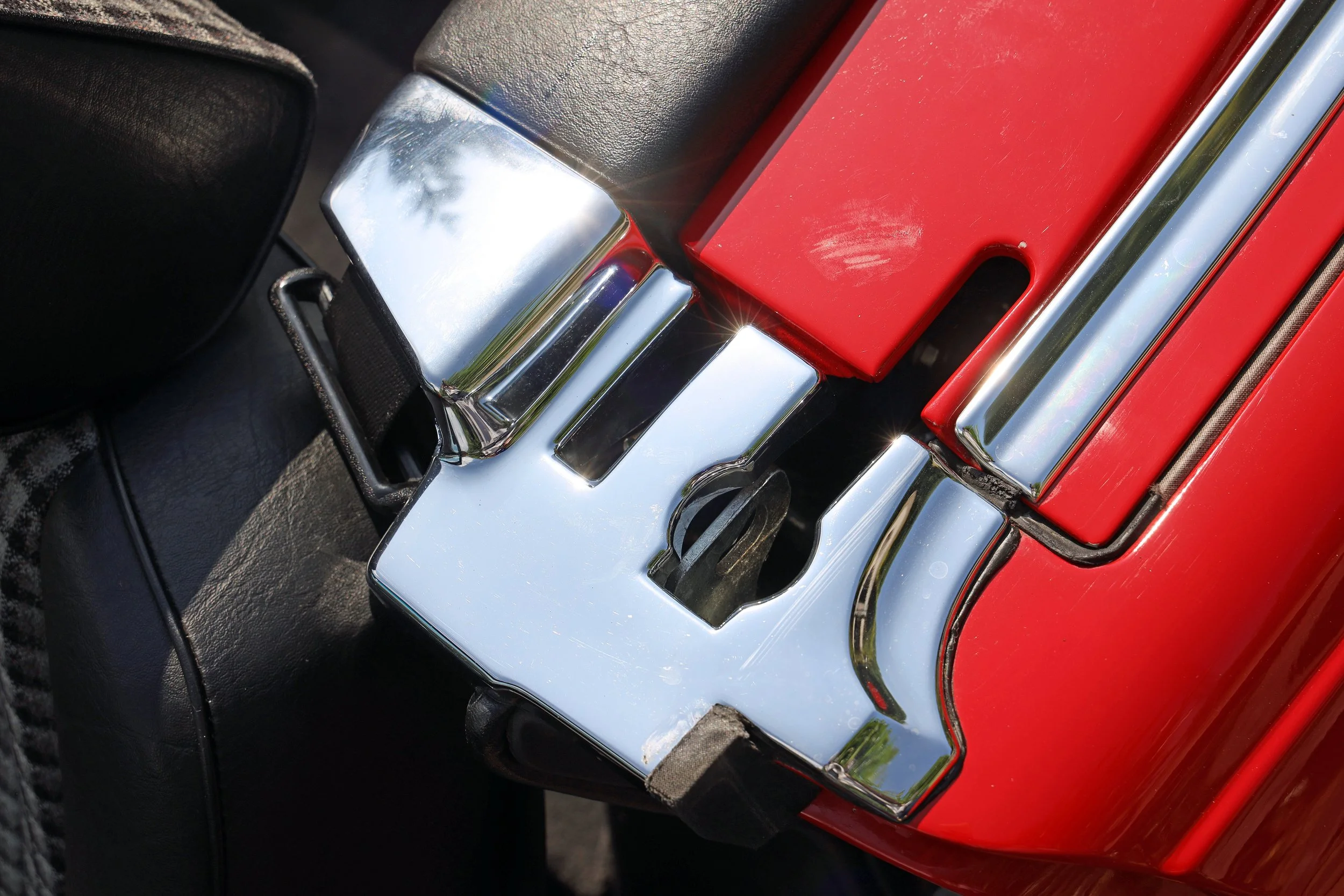 The 4.2-litre V8 neatly fills the engine bay, dominated by the substantial air filter. The engine, its ancillaries and surroundings are very clean and well-detailed, and the fact that the red paint in the bay matches that of the exterior does back up the assumption that all - or at least most - of the exterior finish is all-original. There’s no sign of any DIY wiring plumbed in, and after the recent service just over 200 miles ago, all the fluids look healthy and are at the right levels. The soundproofing/insulation material under the bonnet is undisturbed and undamaged, and there are bonus points for many of the original information and warning stickers still being in place.